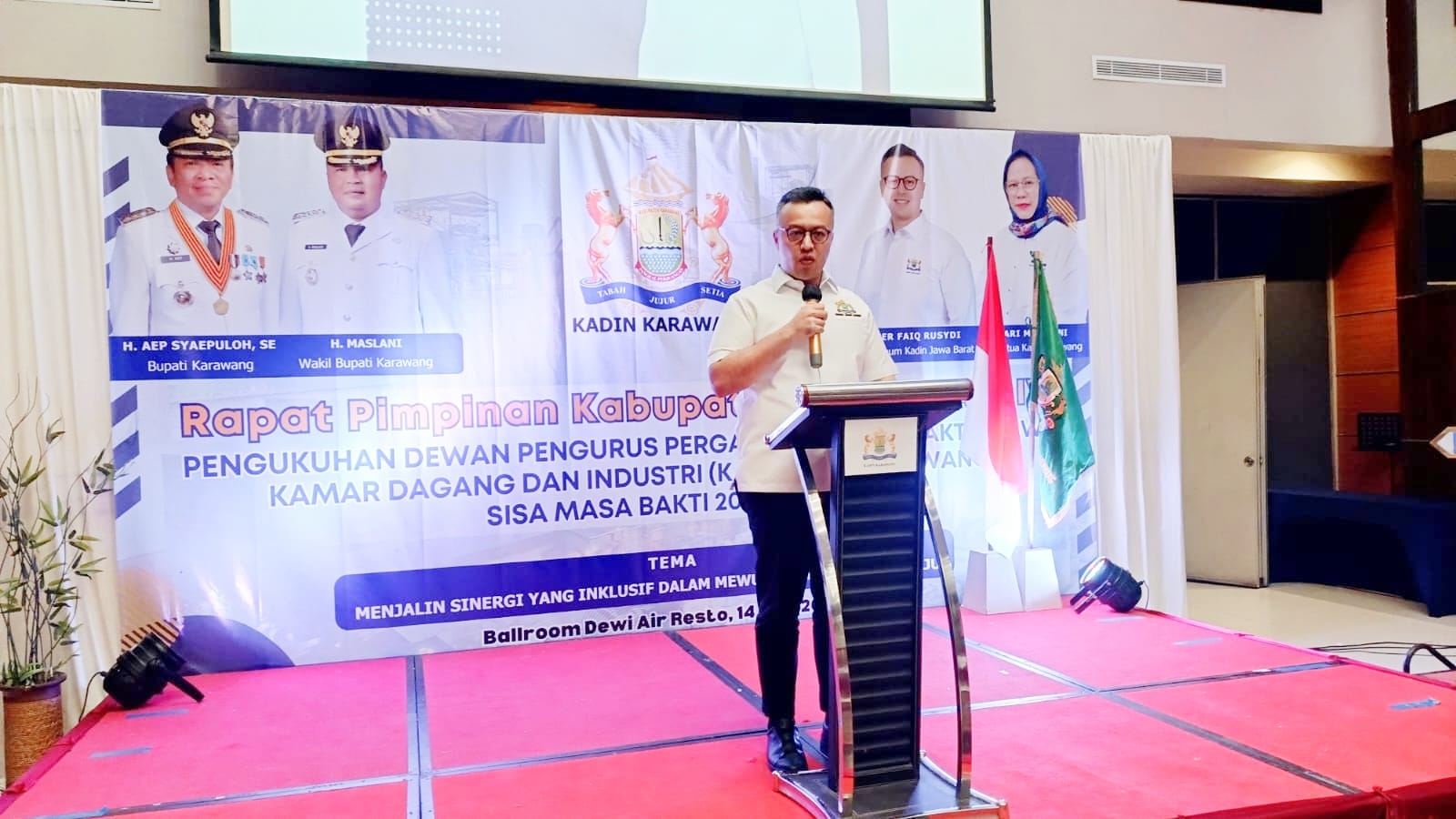 KARAWANG-Ketua Umum KADIN Provinsi Jawa Barat, Almer Faiq Rusydi, mengukuhkan Dewan Pengurus Pergantian Antar Waktu (PAW) KADIN Kabupaten Karawang Masa Bakti 2021-2026 dan membuka secara resmi Rapimkab IV di Resto Dewi Air, Sabtu (14/6/2025).
