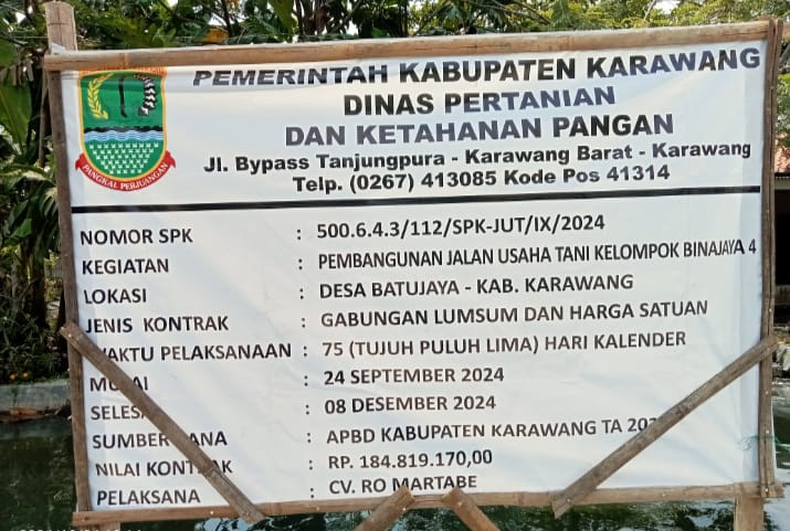 KARAWANG-Proyek pembangunan jalan usaha tani (JUT) Kelompok Binajaya 4 di Desa Batujaya, Kecamatan Batujaya, yang baru selesai dan didanai melalui bantuan dari Dinas Pertanian dan Ketahanan Pangan Kabupaten Karawang tahun 2024, diduga tidak sesuai dengan spesifikasi yang telah ditetapkan dalam petunjuk pelaksanaan dan petunjuk teknis.