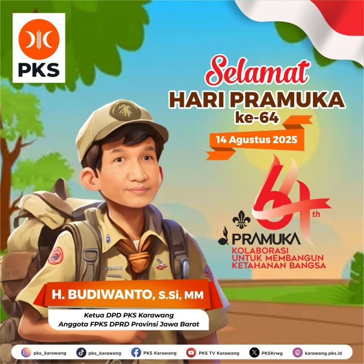 KARAWANG-Anggota DPRD Provinsi Jawa Barat dari Fraksi PKS, H. Budiwanto, S.Si., M.M., mengajak generasi Pramuka milenial dan Gen Z untuk tampil sebagai motor penggerak perubahan melalui kolaborasi untuk membangun ketahanan bangsa. Pesan ini disampaikannya dalam momentum Hari Pramuka ke-64 yang diperingati pada 14 Agustus 2025.