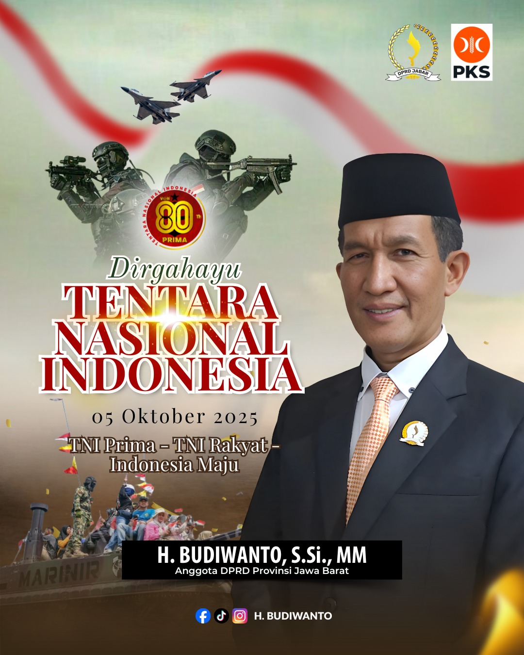 KARAWANG-Dalam momentum Hari Ulang Tahun Ke-80 Tentara Nasional Indonesia (TNI), anggota DPRD Provinsi Jawa Barat dari Fraksi PKS, H. Budiwanto, S.Si., M.M., menyampaikan apresiasi dan penghargaan setinggi-tingginya atas pengabdian panjang TNI dalam menjaga kedaulatan, keutuhan, dan keamanan bangsa Indonesia.