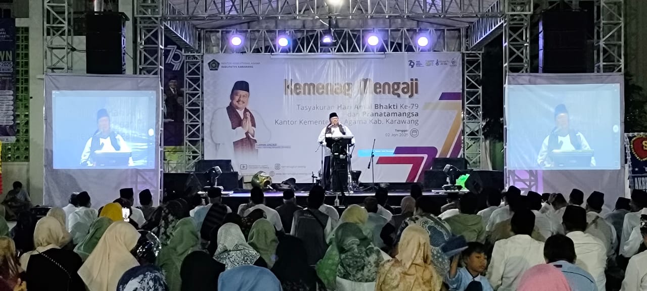 KARAWANG-Kementerian Agama (Kemenag) Kabupaten Karawang menggelar acara Kemenag Mengaji yang dipadukan dengan Tasyakkur Hari Amal Bhakti (HAB) ke-79 dan Pranatamangsa pada Kamis (2 /1/ 2025) malam di halaman Kantor Kemenag Kabupaten Karawang.