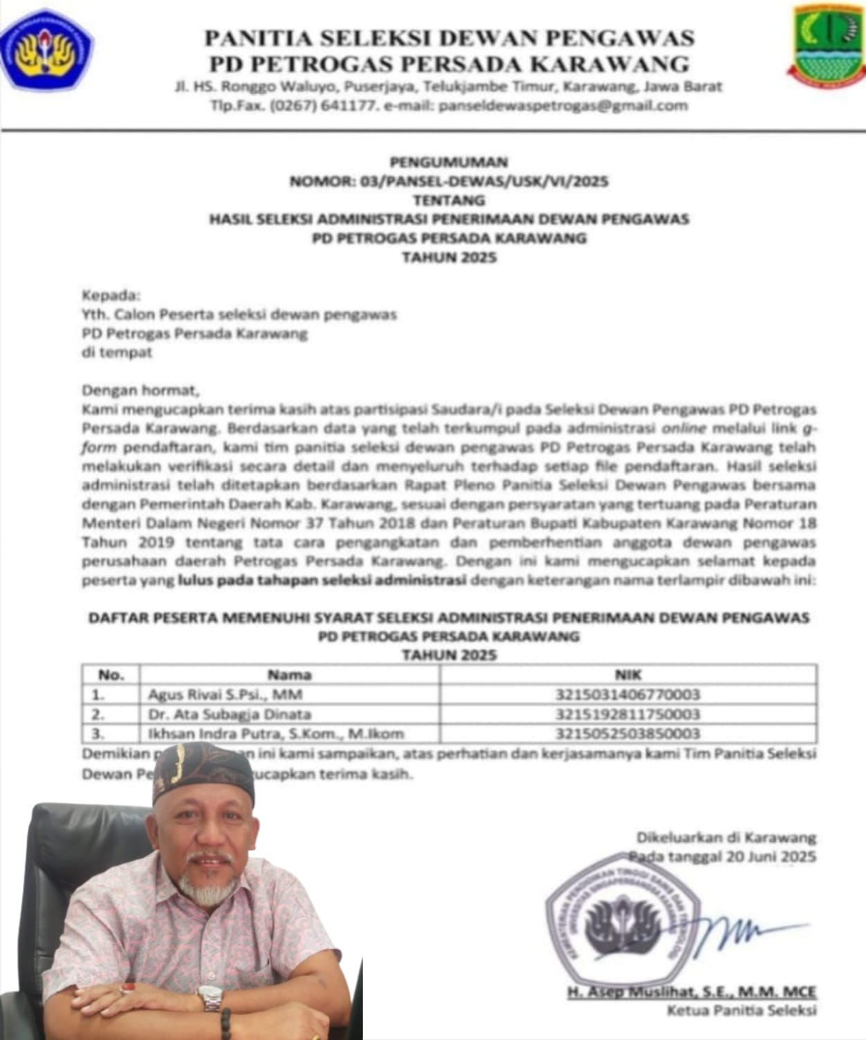 KARAWANG-Tiga calon Dewan Pengawas (Dewas) PD Petrogas Persada Karawang dikabarkan telah selesai mengikuti tes Uji Kelayakan dan Kepatutan (UKK).